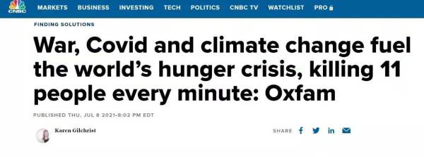 报告称,自新冠肺炎疫情在全球暴发以来,处于饥荒的人口数量已经增长了6倍。据估算,全球每分钟死于饥饿和营养不良的就有11人,远高于每分钟死于新冠病毒的7人。