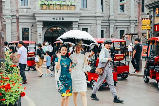 宁波方特东方欲晓通过复古建筑、布景、主题演艺和年代美陈,精心打造了六大历史主题区域,让游客徜徉在百年历史情境中,沉浸式体验近现代时期独具特色的社会风貌和人文风情。一位拥有百万粉丝的视频博主在游玩后表示:“园区的景观都非常有特色,充满京韵的北平街,重现十里洋场繁华的上海街,红色氛围浓厚的延安街,让我感觉像是坐上时光机器回到了祖辈们的年代。”