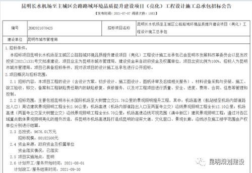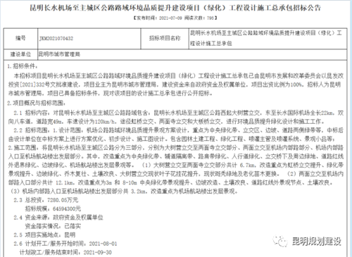 近日,昆明市城市管理局发布《昆明长水机场至主城区公路路域环境品质提升建设项目(亮化)工程设计施工总承包招标公告》《昆明长水机场至主城区公路路域环境品质提升建设项目(绿化)工程设计施工总承包招标公告》,计划对昆明长水机场至主城区公路进行亮化和绿化提升改造。