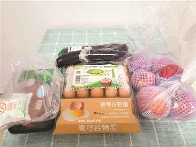 从包装来看,记者下单购买的四款商品,鸡蛋在塑料袋上标注了“易碎”,并且是跟其他三款商品分开,独立包装。猪肉是壹号土猪,因此是放置在塑料盒并有保鲜薄膜封口,贴上了“壹号土猪”、产品生产日期、保质期等详细介绍以及“动物产品检疫合格”的标签。每个苹果自带网状塑料泡沫,并装载在一个塑料袋中。两根茄子就用保鲜膜包装好。