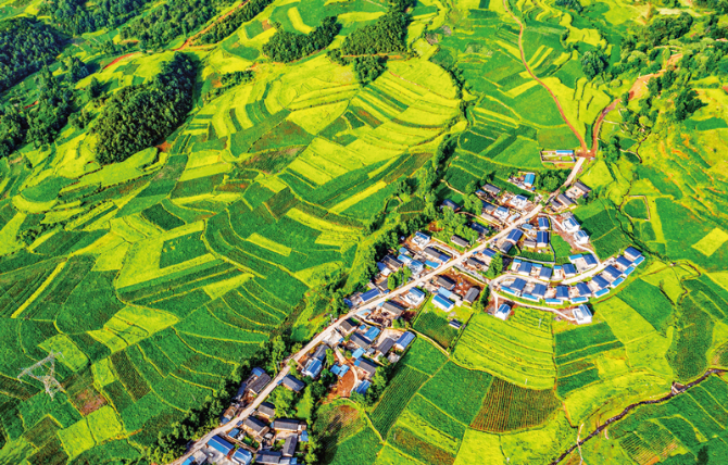 四川省凉山彝族自治州布拖县把特色种植产业作为经济发展的重要内容,促进居民增收,助力乡村振兴,构成了一幅幅美丽山乡新画卷。图为被浓绿掩映的布拖县村落。 中国文联供图 邓邦敏/摄