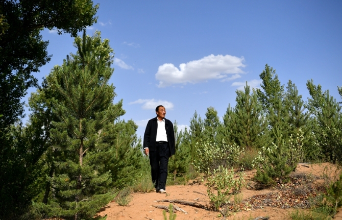 干成治沙一件事,就算没白活。“七一勋章”获得者、治沙英雄石光银在自己最早治理的“狼窝沙”林地里。新华社记者 刘潇/摄