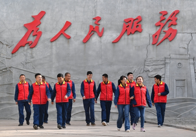 为人民服务!熠熠生辉的“红色讲台”。2021年3月30日,国网延安供电公司枣园供电所张思德服务队队员结束集体学习活动后走向工作岗位。新华社记者 张博文/摄