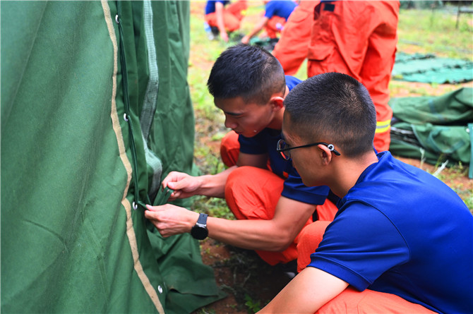 集体搭建帐篷,第一次野外整理内务,第一次山路奔袭……野外驻训让昆明市森林消防支队直属大队二中队的新消防员们,从熟悉的营区到陌生的野外,从平整的水泥地到崎岖不平的黄土地,从舒适的房间到时冷时热的帐篷,经历风雨和成长。