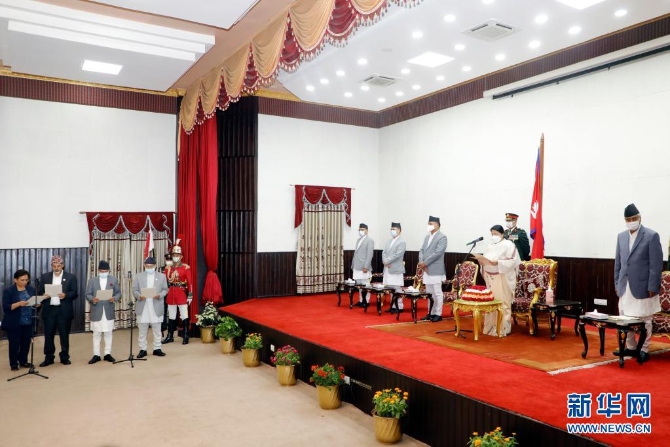 7月13日,德乌帕在尼泊尔总统班达里主持下宣誓就任尼总理。新华社发(尼泊尔总统府供图)