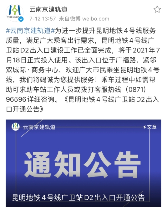 记者日前从云南京建轨道公司获悉,为进一步提升昆明地铁4号线服务质量,满足广大乘客出行需求,昆明地铁4号线广卫站D2出入口建设工作已全面完成,将于2021年7月18日正式投入使用。