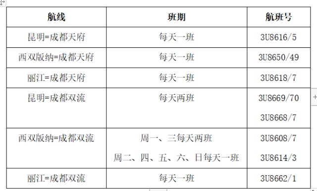 据了解,昆明-成都天府、西双版纳-成都天府、丽江-成都天府三条往返航线均采用空客A320执飞,每天一班,与三地现有成都双流航线形成互补的班期和时刻,方便旅客合理安排出行时间和线路,切实满足广大旅客的多样化出行需求。航班号具体如下: