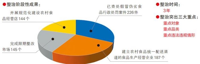 在专项整治行动中,全省各级市场监管部门全面落实“四个最严”要求,按照“1+3”的目标(即每年推进1项重点行动,1年1项重点内容,3年接续重点推进),不断加大农村假冒伪劣食品专项整治行动工作力度。突出三大重点:重点对象。小作坊、小商店、小摊点、小餐馆、小商贩等食品生产经营主体和农村集市、食品批发市场等;重点品类。方便食品、休闲食品、酒水饮料、调味品、奶及奶制品、肉及肉制品等农村消费量大的食品品类;重点违法违规情形。假冒食品、“山寨”食品、“三无”食品、劣质食品、超过保质期食品等重点违法违规情形,边打击、边规范、边提升,着力整治农村市场假冒伪劣食品等突出问题。