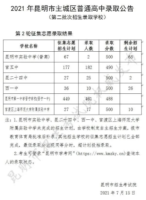 昆明信息港讯 记者上官艳君 7月15日,昆明市招生考试院发布2021年昆明市主城区普通高中录取公告(第二批次招生录取学校)第2轮征集志愿录取结果。考生可登录“昆明市学考网”(www.kmzky.cn)查询本人的录取状态。