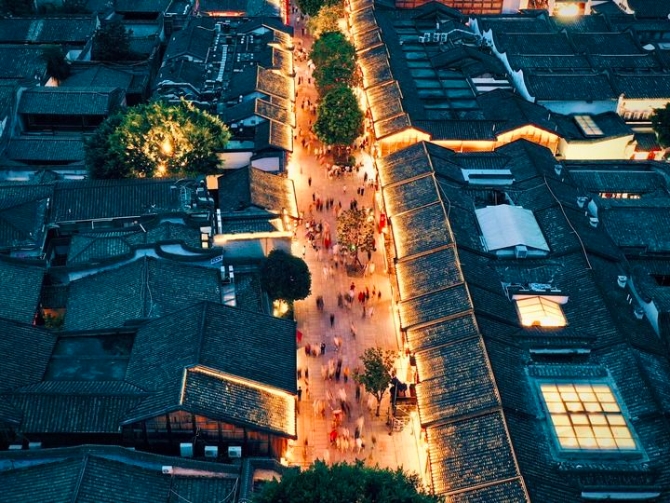 ↑7月10日,福州三坊七巷文化街区南后街上游人如织(无人机照片)。