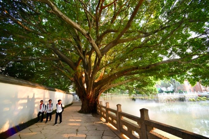 ↑3月15日,福州冶山春秋园内几位放学的小学生经过古榕树。