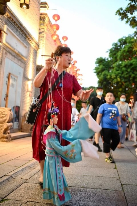 ↑7月11日,福州三坊七巷历史文化街区南后街上,艺人在进行提线木偶表演。