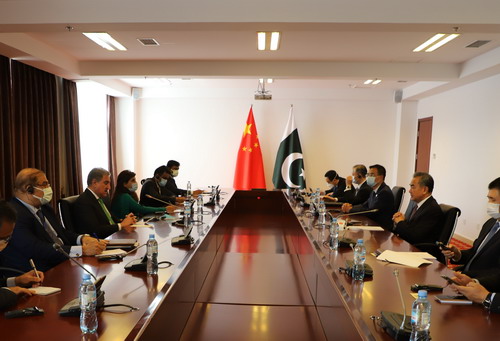 当地时间2021年7月14日,国务委员兼外长王毅在杜尚别会见巴基斯坦外长库雷希。
