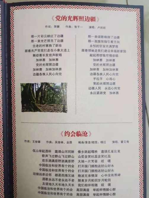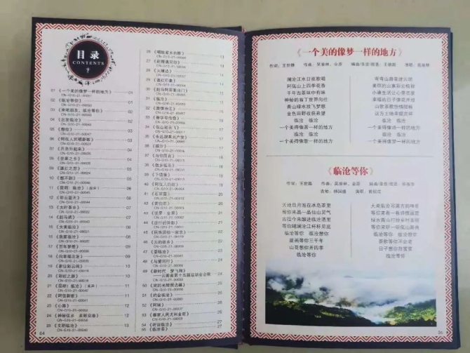 为充分展示临沧文化旅游建设丰硕成果,抓住打造世界一流“健康生活目的地牌”和大滇西旅游环线建设机遇,努力打造”大美临沧,美在乡间;花开四季,香飘八方”乡村旅游品牌,把临沧市建设成为国际国内知名的乡村旅游目的地和云南省乡村旅游发展先行区,临沧市文化和旅游局派专人多次深入各县(区)开展调研,对全市文化旅游歌曲进行认真遴选,优中选优,编辑了这本包含《阿佤人民唱新歌》《月亮升起来》《火塘边》《彩虹之路》《百年梦想》《临沧茶》《听说临沧》《出发临沧》《永远跟着共产党》《民族团结一家亲》《党的光辉照边疆》等55首歌曲的U盘碟片。
