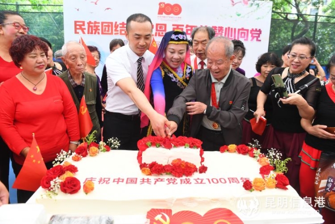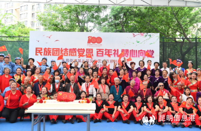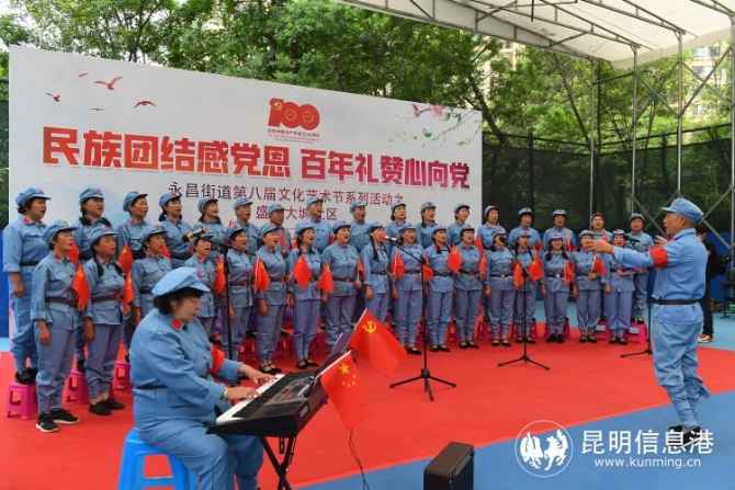 昆明信息港讯 记者徐毅杰 “五十六个民族五十六朵花、朵朵开在阳光下,各族人民亲如一家,就像长青树岁岁发青芽”……优美的旋律响起,动听的歌声回响,7月16日,西山区永昌街道盛高大城社区“民族团结感党恩 百年礼赞心向党”活动热闹开启,社区各族同胞们登台当“明星”,通过一个个自编自演的精彩节目庆祝中国共产党成立100周年。