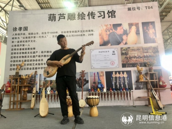 非物质文化遗产葫芦雕绘传承人徐孝国也来到展览馆,吉它葫芦丝,压板葫芦,三弦葫芦、古筝葫芦、中阮葫芦、手鼓葫芦……由徐孝国雕绘而成的以葫芦作为音响体的乐器受到了社会各界的喜爱,被中央音乐学院指定为云南省葫芦文化乐器专用提供商。