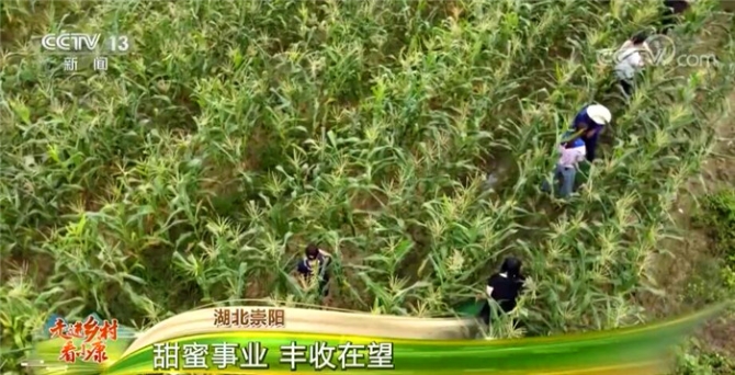 这里是湖北省崇阳县吴城村,现在青山河两岸的玉米地里已经一派繁忙,农户正忙着采摘即将上市的超甜水果玉米,不少游客也参与其中。这里种植的水果玉米是一年可种两季的新品种,可以当水果生吃,因为采取订单销售的模式,采摘后的玉米将直接销往各地,每亩可以为农户带来5000元—8000元的收入。