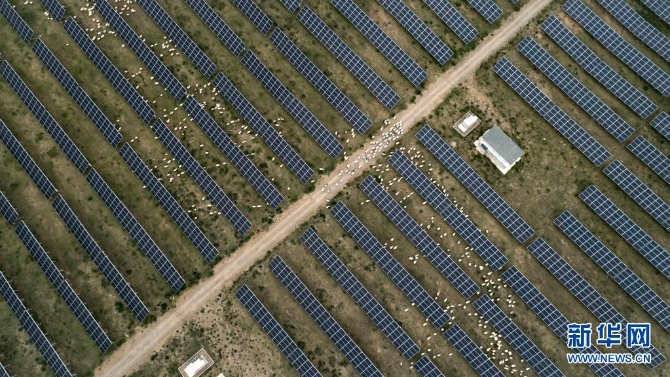 羊群在青海省海南藏族自治州共和县光伏产业园吃草(2019年6月16日摄,无人机照片)。新华社记者 吴刚 摄