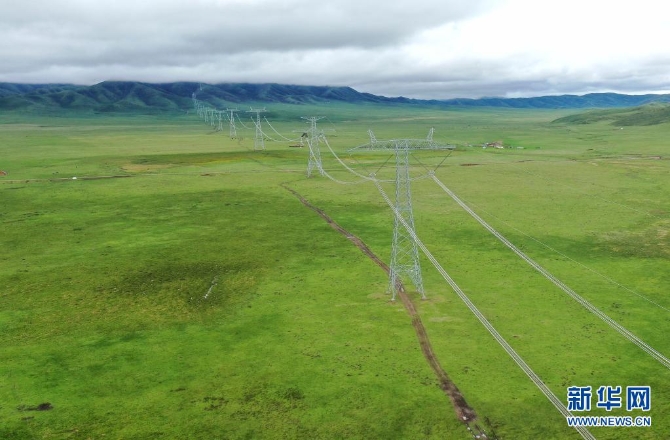 6月17日在青海省黄南藏族自治州河南蒙古族自治县拍摄的青豫特高压直流工程。新华社发(谢莉蓉 摄)