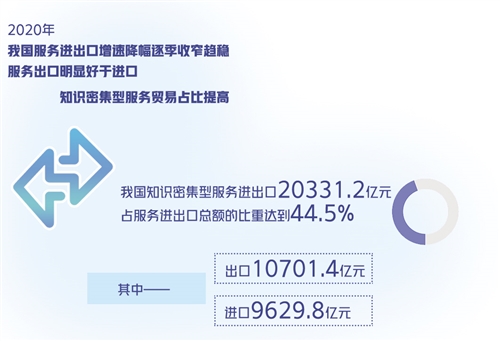 2020年,受新冠肺炎疫情影响,我国传统服务贸易大幅下滑,数字贸易逆势而上,知识密集型服务进出口额为20331.2亿元,同比增长8.3%,占服务进出口总额的比重达到44.5%,提升9.9个百分点。同年,跨境电商进出口总额达1.69万亿元,同比增长31.1%,成为货物贸易增长的有力支撑。