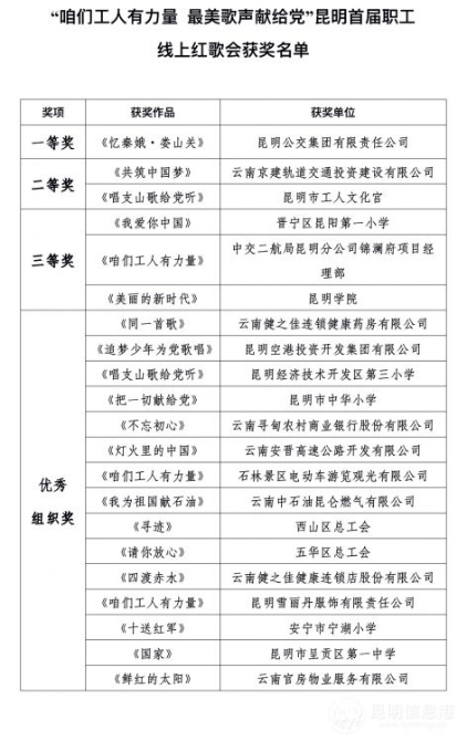 昆明信息港讯 记者戴兴 华苑廷 近日,由昆明市总工会主办,昆明信息港彩龙社区承办的“‘咱们工人有力量 最美歌声献给党’昆明首届职工线上红歌会”主题活动完成最后的专业评审,评审团结合参赛作品的网络投票和演唱专业性进行了综合评定。