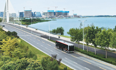 河南省郑州市郑东新区自动驾驶公交1号线车辆行驶在试运行的道路上。新华社记者 李 安摄