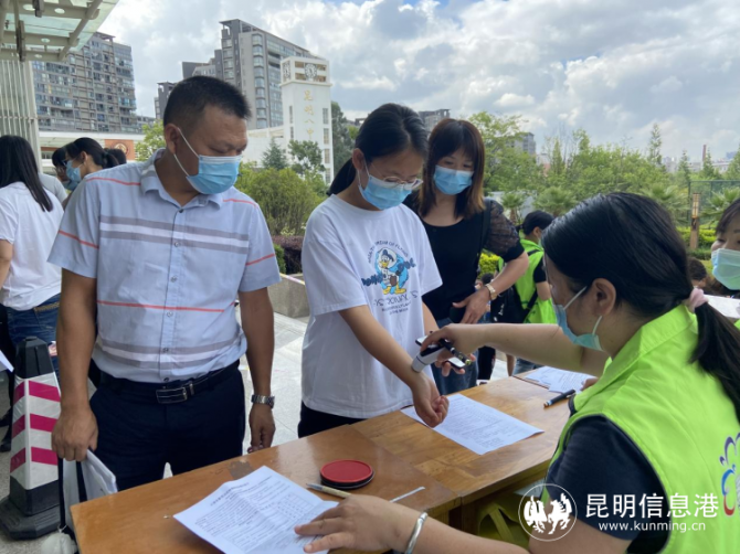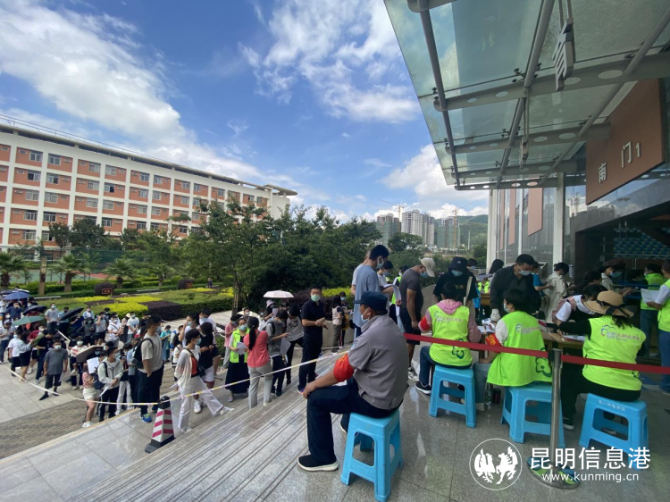 7月21日10点左右,在昆八中未成年人临时接种点外,准备接种疫苗的学生在监护人陪同下正有序地排队。测量体温、核实学生身份证、登记学生家长(监护人)身份证号码、测量血压、接种疫苗……学生们按流程进行接种。