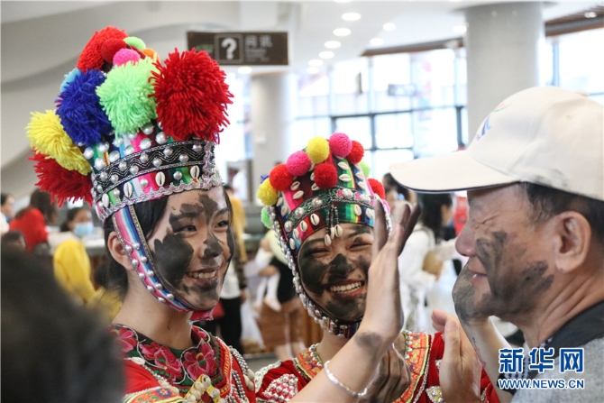 普者黑游客服务中心现场工作人员与游客体验“抹花脸”(7月18日摄)。新华网发(张东伟 摄)