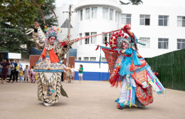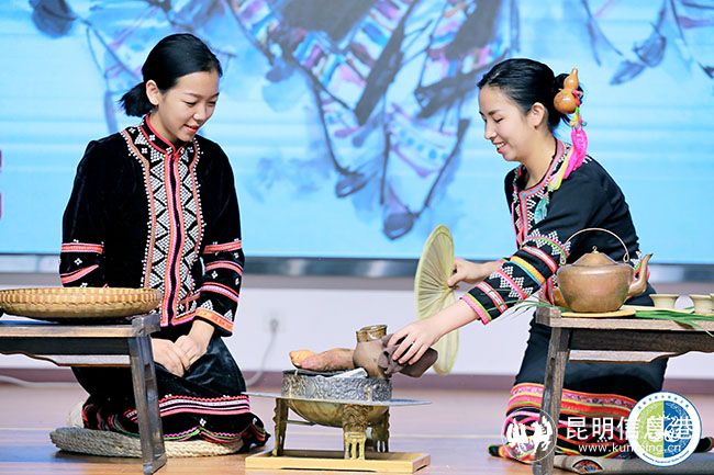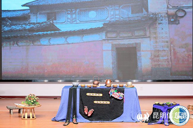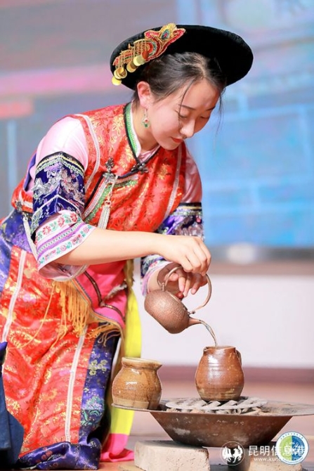 2号选手李珺表演的主题是《云鹤携思归》,茶品为晒青绿茶,茶席底铺蓝色亚麻布,上叠铺白族绣花飘带;茶席左边摆放火塘,用来烤茶和煨水;旁边以簸箕做形,围腰飘带搭配上放表演所需配料;茶具采用土陶罐、土陶杯、铜壶和铁壶。先将陶罐在炭火上烤热,再将茶叶放入陶罐中烘烤,烤茶讲究手法,抖、转、翻、簸,让茶叶在陶罐内均匀地受热,以防茶叶烤糊。伴着噼里啪啦的声音阵阵茶香飘出,这时茶便烤好了,将烤好的茶叶取出,沸水注入铜壶,茶与水相互交融,在炭火上继续烤煮,茶叶在其中翻腾起舞,好似白族人民的热情好客。