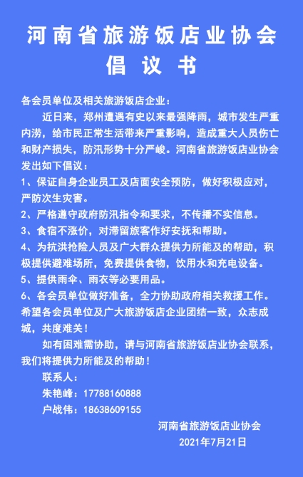 近日来,郑州遭遇有史以来最强降雨,城市发生严重内涝,给市民正常生活带来严重影响,造成大量人员伤亡和财产损失,防汛形势十分严峻,河南省旅游饭店业协会发出如下倡议: