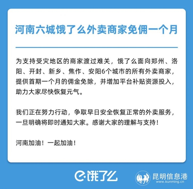 昆明信息港讯 记者昝娟娟 7月22日,饿了么宣布,面向郑州、洛阳、开封、新乡、焦作、安阳等6个城市所有的外卖商家,提供首期一个月的佣金免除,并将增加平台补贴资源投入,助力商家渡过难关。