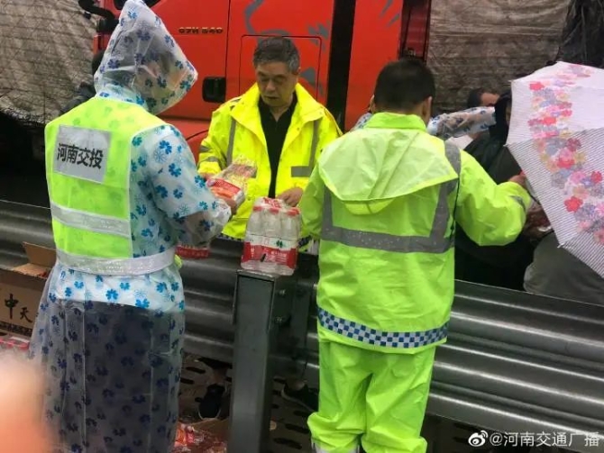 连霍高速巩义段620公里处因暴雨车辆滞留,河南巩义服务区人员火速驰援,为被困人员送去应急必需品。