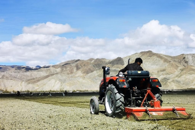 2020年5月4日,雅鲁藏布江及其主要支流年楚河的汇流处河谷地带,农民在农田里辛勤劳作。新华社记者 沈虹冰 摄