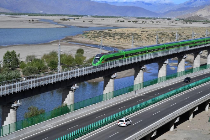 2021年6月16日,试运行的复兴号列车行驶在雅鲁藏布江畔。新华社记者 觉果 摄