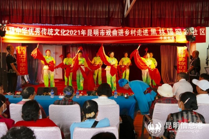 7月22日上午,弘扬中华优秀传统文化2021年昆明市戏曲进校园、进乡村系列活动,来到五华区黑林铺镇昭宗社区“滇戏、花灯交流馆”,牛街社区滇戏传承基地演员们为社区群众带来优秀传统滇戏剧目《桂英打雁》。
