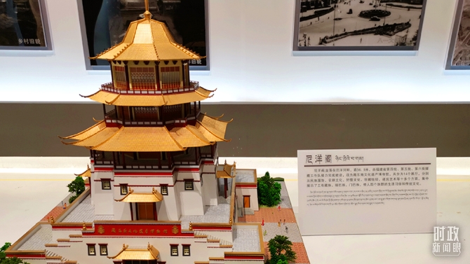 △这是林芝市城市规划馆展示的尼洋阁模型,实际建筑高36.9米,由福建省三批援藏工作队接力完成建设,现为藏东南文化遗产博物馆。(总台央视记者李晓周拍摄)