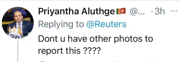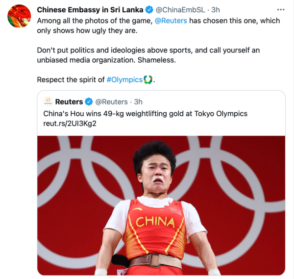 中国驻斯里兰卡大使馆也在推特上批驳了路透社这种做法。大使馆在推文中写道:“在所有比赛照片中,路透社选了这么一张,只能体现出她(他)们的丑。别把政治和意识形态置于体育之上,也别管自己叫公正的媒体机构了。无耻。尊重奥林匹克精神吧。”