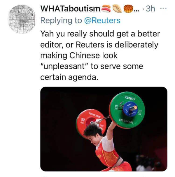 如图所示,路透社推文中的配图选了一张侯志慧正在用力时的图片,表情显得极不自然。这则推特下面很快有网友注意到了这点,质疑说:“你们没有其他照片来报道这事了吗?”↓
