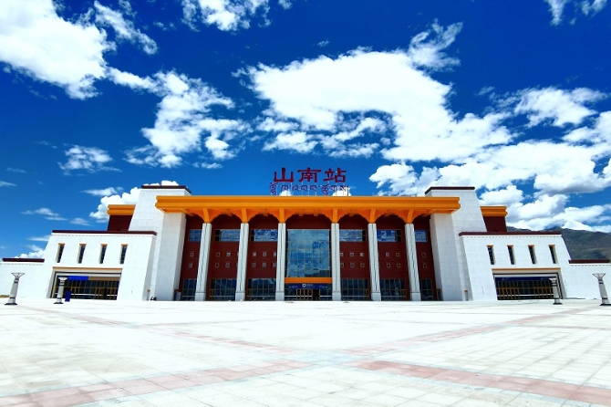 山南站和林芝站是两个大站,站房面积均为1.5万平方米,最高峰均可容纳2000人同时候车。山南站设有2座站台、5条到发线,其设计理念源于西藏第一座宫殿——雍布拉康,充分彰显“人文山南”的理念。车站外挑檐廊立柱,内嵌藏红色线条柱脚,增加石刻吉祥结图案,候车大厅吊顶采用藻井与吉祥结相融合的设计,完美诠释“藏之源、山之南、河之畔、湖之蓝”的山南印象。