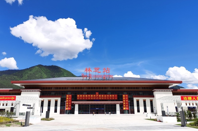 林芝站设有3座站台,6条到发线。站房设计运用雪白、藏红等独具民族特色的色彩,体现雅鲁藏布江大峡谷巨大的山水落差、丰富的生态气候和壮丽的自然景色,彰显“生态林芝”的理念。