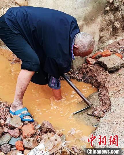 商彩锋的手机里保存的很多照片、视频,都与本次暴雨有关。其中一张照片上,一名八旬老人冒着大雨、猫着腰奋力清掏村内道路排水渠。