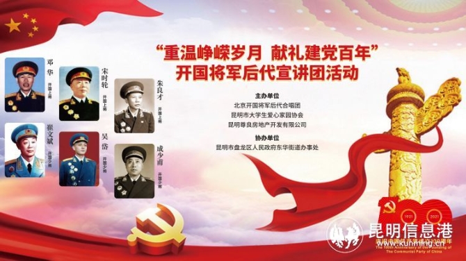 据悉,此次活动邀请了开国将军后代,包括邓华将军之女邓英、朱良才将军之女朱筱秋、宋时轮将军之女宋百一、崔文斌将军之子崔越岭、吴岱将军之子吴志民、成少甫将军之子成健等,讲述父辈的光荣事迹。共有108名来自昆明市尊良房地产开发有限公司和昆明市盘龙区东华街道办事处的工作人员参与活动。