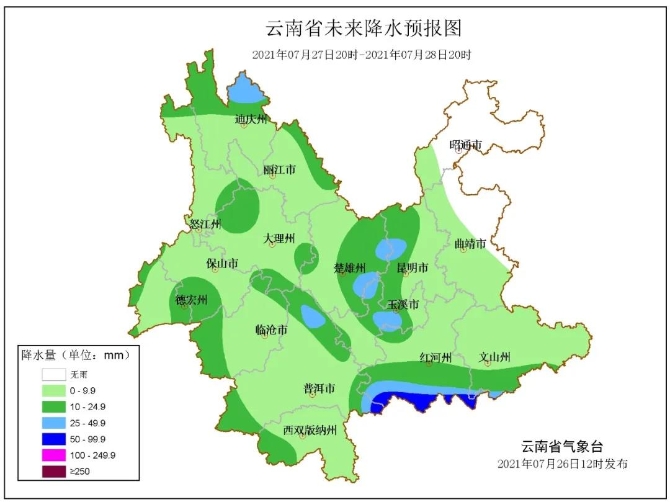 7月26日20时-7月27日20时:迪庆西部、怒江北部、大理南部、保山、德宏、临沧、普洱、西双版纳、玉溪西部、红河南部多云间阴有小到中雨局部大雨,其他地区多云有阵雨局部中雨。