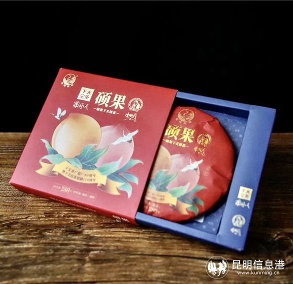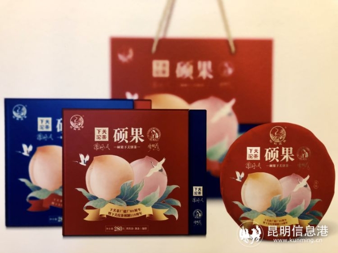 “硕果”茶饼包装上两个硕大鲜红的蟠桃,和茶品名字“硕果”相呼应,寓意蟠桃献寿,庆祝下关沱茶建厂80周年,也祝愿下关沱茶走向更大辉煌。