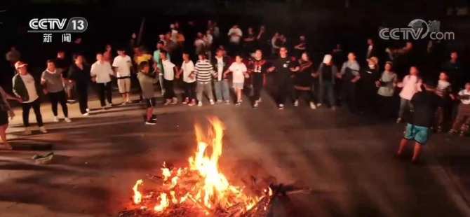 随着夜幕降临,漆黑的夜空被火光点亮,宁静的夜晚也被欢呼声打破,人们欢聚一堂,用一把把火把传递着对未来美好生活的期待。