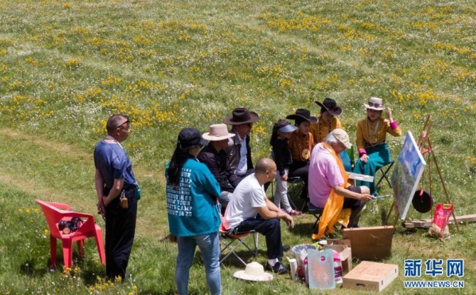 7月22日,在道孚县玉科大草原,一名画家在花海里创作油画,吸引了当地牧民和游客围观。新华社记者 江宏景 摄