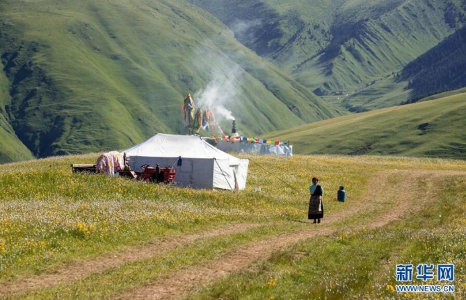7月25日,在道孚县龙灯草原,藏族群众搭起帐篷休闲。新华社记者 江宏景 摄