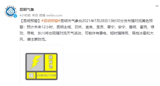 昆明市气象台今天中午发布强对流黄色预警:预计未来12小时,昆明主城、石林、宜良、呈贡、晋宁、安宁、嵩明、富民、禄劝、寻甸、东川将出现强对流天气,可能伴有雷电、短时强降雨、局地冰雹和大风。请市民们及时关注天气预报,做好防范措施。