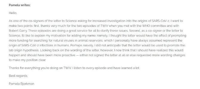 “我也许天真了,没想到这封信会被用来推广实验室起源假说,”比约克曼写道,“回顾这封信的措辞,我现在认为我本应预料到这样的后果。我本应更加积极主动——要么根本不签署这封信,要么要求修改更多措辞以表明我的立场。”