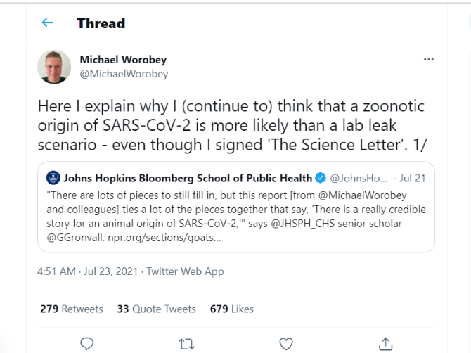 此外,参与公开信联署的亚利桑那大学进化生物学家迈克尔·沃罗比日前也在社交媒体上澄清,他在公开信上签名,让人误以为他认为“实验室泄漏”假说更有可能,但实际上他认为动物起源更有可能。